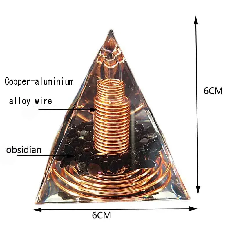 This obsidian orgonite pyramid is designed to promote balance, grounding, and positive energy within your environment. Featuring a spiral copper wire core combined with natural obsidian crystal, it blends sacred geometry with energy-inspired design. The pyramid shape is traditionally believed to help focus and amplify energy flow, making it a popular addition to meditation and mindfulness practices. Obsidian is often associated with protective and grounding properties, helping create a calm and centered atmosphere. Its handcrafted appearance gives each piece a unique character while adding an elegant decorative touch to any space. Ideal for yoga studios, meditation areas, desks, or home décor, this ornament enhances both spiritual settings and modern interiors. Many users incorporate orgonite pyramids into chakra work, relaxation routines, or energy-focused practices. The compact size makes it easy to display without taking up much space. Whether used for meditation or as a meaningful decorative piece, it adds a peaceful presence to your surroundings. This orgonite pyramid combines spiritual symbolism, natural crystal beauty, and artistic craftsmanship in one distinctive ornament.